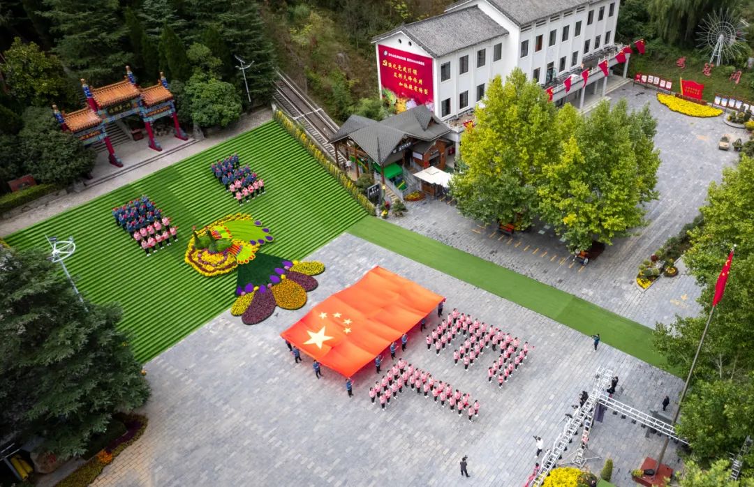 活動現(xiàn)場,景區(qū)員工整齊列隊拼字“73”,并傳遞巨幅國旗為祖國慶生,向祖國獻禮!