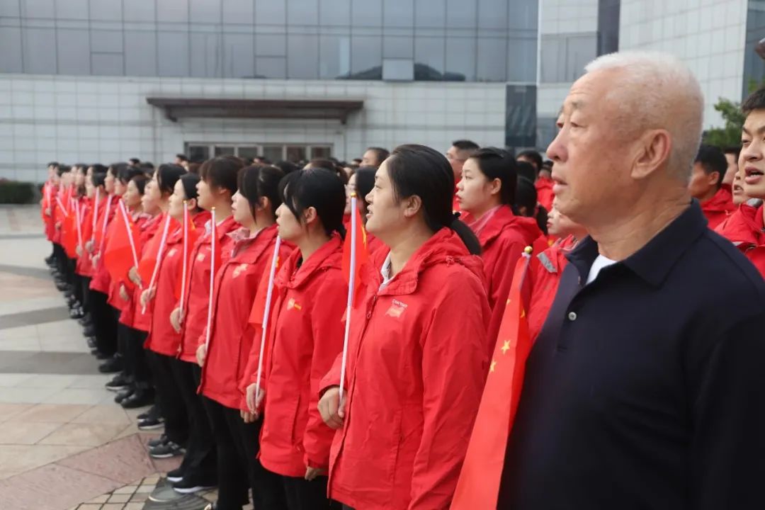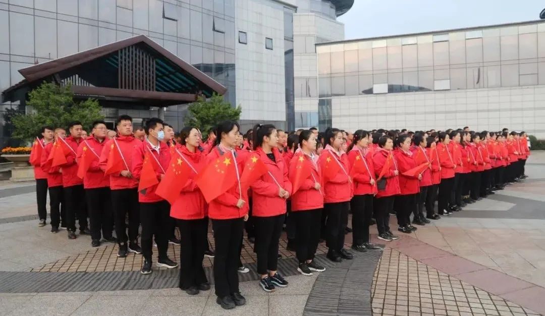 早上,參加升旗儀式全體員工在升旗臺(tái)前整齊列隊(duì),7時(shí),升旗儀式正式開(kāi)始,三位護(hù)旗手肩扛一面五星紅旗,邁著鏗鏘有力、整齊劃一的步伐,護(hù)送五星紅旗到升旗臺(tái)。“全體肅立、升國(guó)旗、奏唱國(guó)歌!”伴隨指揮員一聲令下,升旗手鄭重有力將國(guó)旗迎風(fēng)撒向天空。伴隨《義勇軍進(jìn)行曲》雄壯的旋律,五星紅旗緩緩升起,迎風(fēng)舒展,在藍(lán)天的映襯下格外鮮艷美麗。