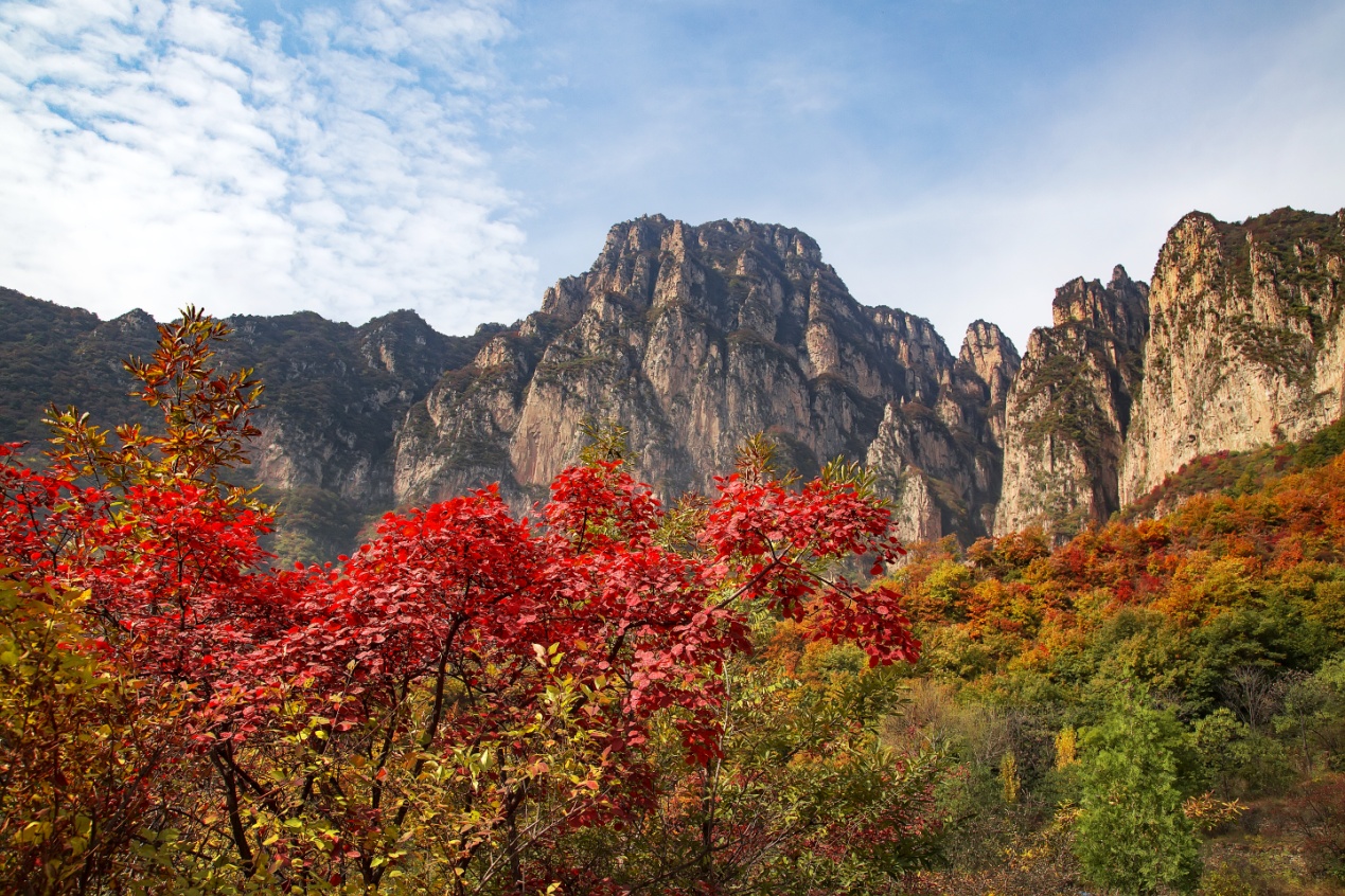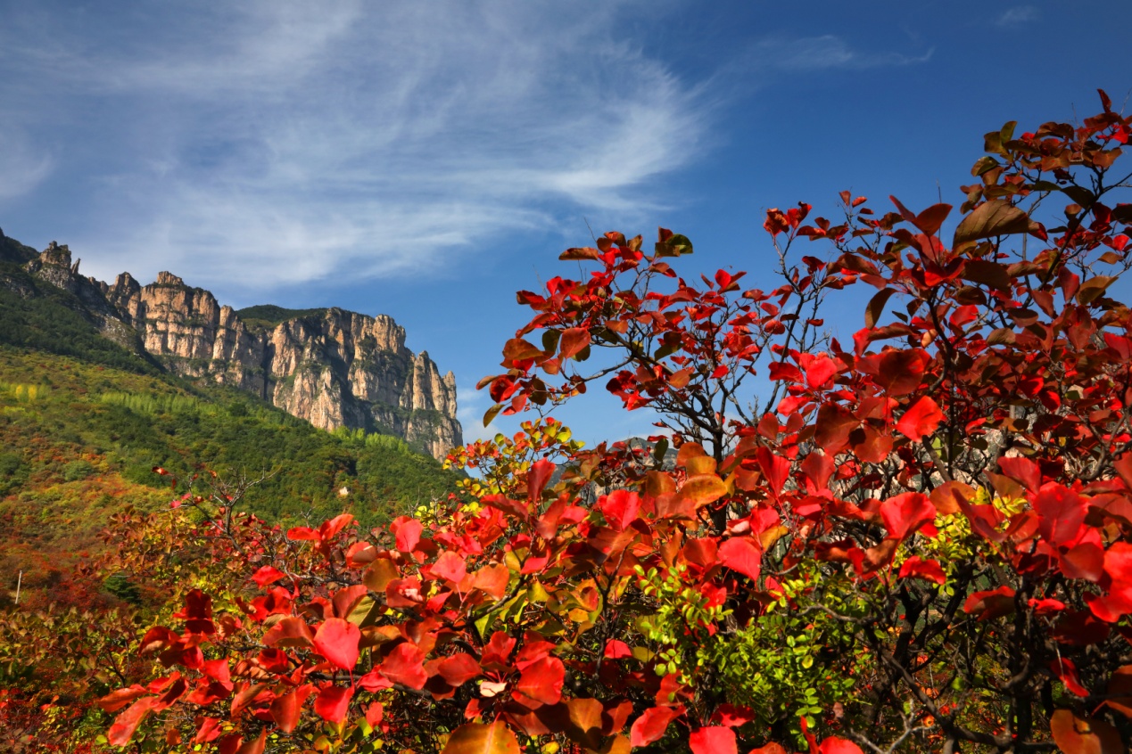 金秋十月,隨著天氣轉(zhuǎn)涼,晝夜溫差變大,河南林州太行大峽谷漸漸浸染秋色。登高遠(yuǎn)眺,似火的紅葉猶如一團(tuán)團(tuán)燃燒的火焰,重巒疊嶂間層林盡染。大自然揮毫潑墨,于翠峰碧水間繪出萬(wàn)千景致,定格出一幅濃墨重彩的秋日畫(huà)卷,置身其間,讓人心曠神怡,嘆為觀(guān)止。