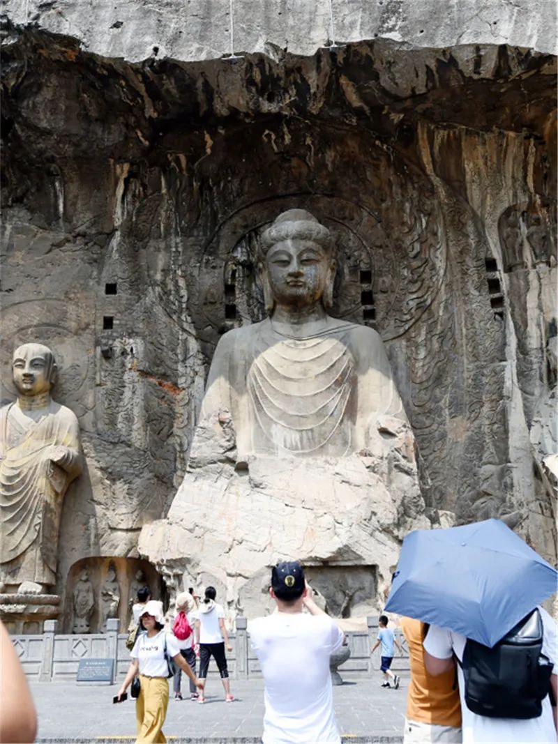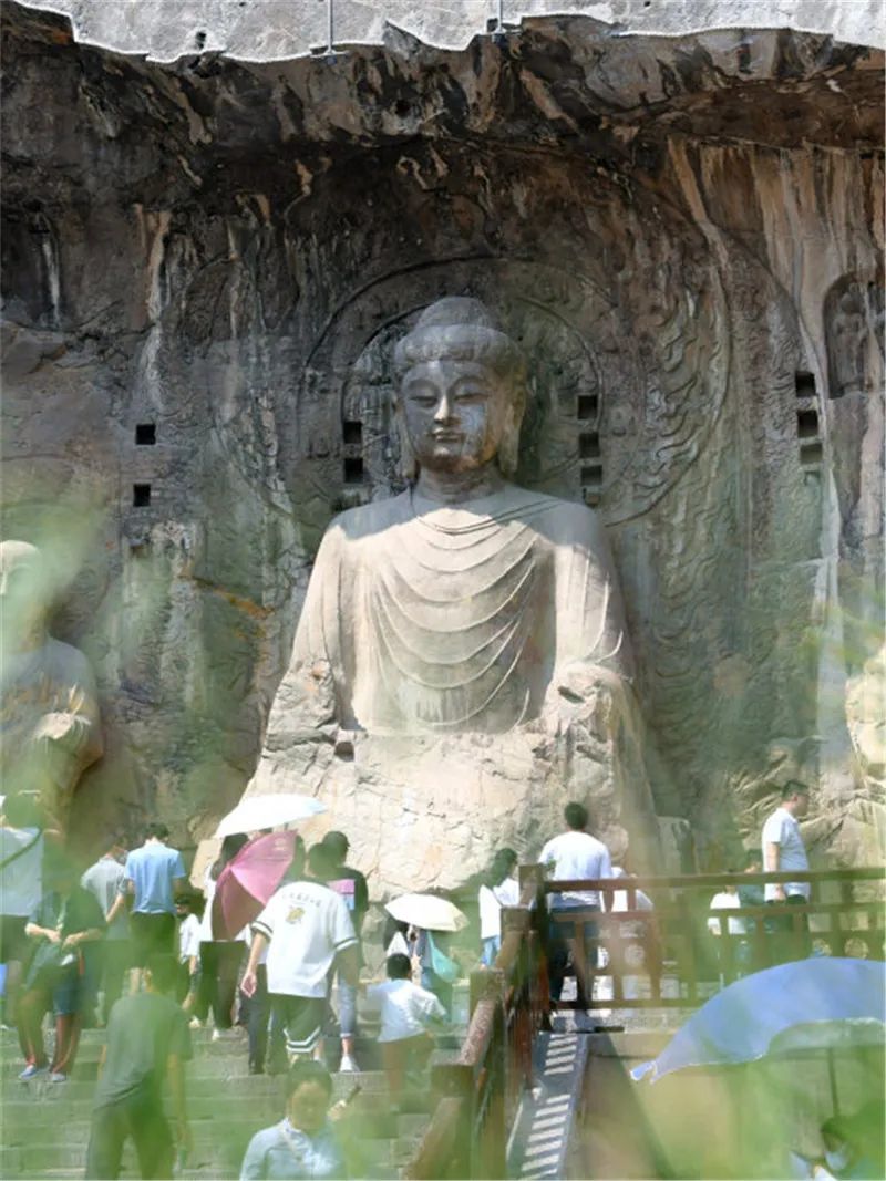 唐代龍門石窟的重點(diǎn)洞窟中,以規(guī)模宏偉、氣勢磅礴的大盧舍那像龕群雕最為著名。奉先寺是龍門石窟開鑿規(guī)模最大的摩崖像龕,這座依據(jù)《華嚴(yán)經(jīng)》雕鑿的摩崖式佛龕,以雍容大度、氣宇非凡的盧舍那佛為中心,用一周極富情態(tài)質(zhì)感的美術(shù)群體形象,將佛國世界那種充滿了祥和色彩的理想意境表達(dá)得淋漓盡致。如果說奉先寺代表著唐代石刻藝術(shù)的最高成就,那么盧舍那大佛就是這座東方石刻藝術(shù)殿堂中最閃耀的明珠。