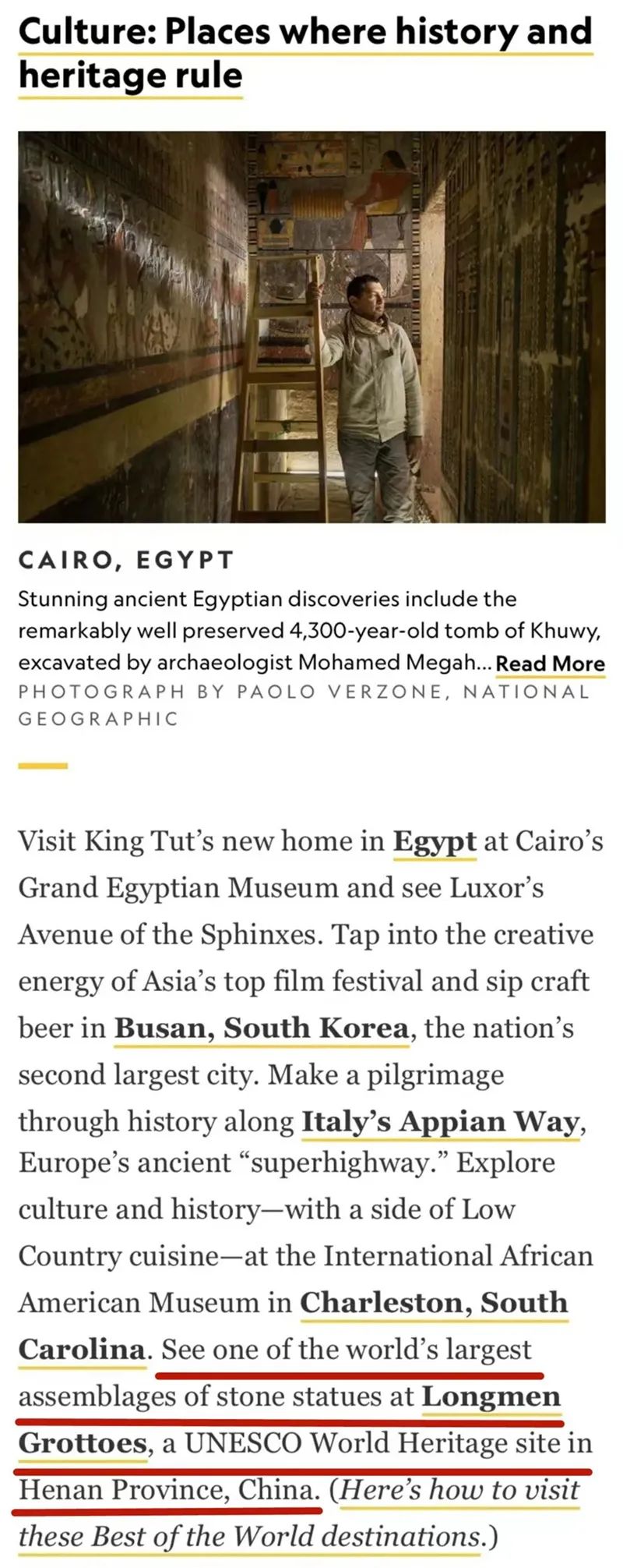 10月27日,美國《國家地理》雜志公布2023年度全球推薦旅游地名單(25處),洛陽龍門石窟作為中國唯一上榜的目的地,入選“文化類”旅游地推薦名單。