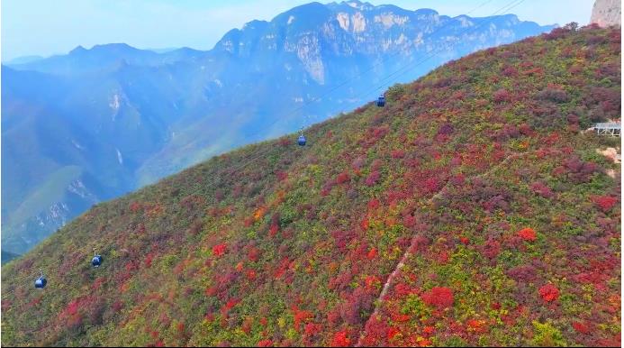 河南云臺山景區(qū),目前進入觀賞紅葉的最佳季節(jié)。此時的云臺山萬畝紅葉紅似驕陽,燦若云霞,美不勝收。云臺山地處太行山南端,是國家森林公園,這里植被茂密,森林覆蓋率高達93%,植物種類達1400多種,其中有千年紅豆杉、千年五角楓、太行花等數(shù)十種珍稀植物。