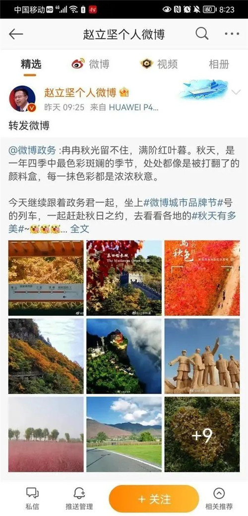 10月25日,外交部發(fā)言人趙立堅(jiān)在個(gè)人微博轉(zhuǎn)發(fā)了一條展示我國(guó)各大城市秋日美景的微博。其中濟(jì)源王屋山景區(qū)、五龍口景區(qū)、濟(jì)水源牡丹花園作為河南優(yōu)質(zhì)代表被重點(diǎn)推薦。網(wǎng)友們直呼:“太美了!”“看到了我的家鄉(xiāng)河南濟(jì)源,王屋山的紅葉太壯觀了!”