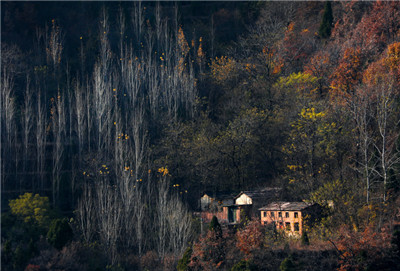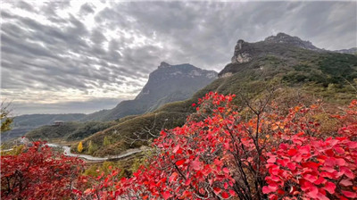 叢山迭嶂,絕壁斷崖,夏天里被郁郁叢林遮掩住的山崖漸漸的裸露出了全貌,赤色的斷崖,陽剛勁露,在色彩斑斕的秋葉映襯下也增添了一絲溫柔與柔美。