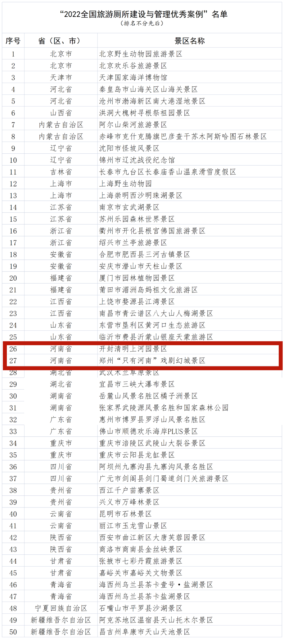 11月15日,文化和旅游部發(fā)布公告,公示“2022全國(guó)旅游廁所建設(shè)與管理優(yōu)秀案例”名單。全國(guó)共50家景區(qū)上榜,河南省開(kāi)封清明上河園景區(qū)、鄭州“只有河南”戲劇幻城景區(qū)榜上有名。
