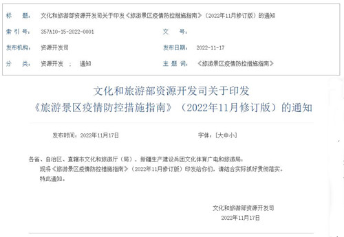 為指導(dǎo)全國旅游景區(qū)因時因勢優(yōu)化完善防控措施,進(jìn)一步提升旅游景區(qū)疫情防控的科學(xué)性、精準(zhǔn)性,針對當(dāng)前疫情防控形勢,11月18日,文化和旅游部在《旅游景區(qū)恢復(fù)開放疫情防控措施指南(2021年10月修訂版)》基礎(chǔ)上,發(fā)布《旅游景區(qū)疫情防控措施指南》(2022年11月修訂版)。