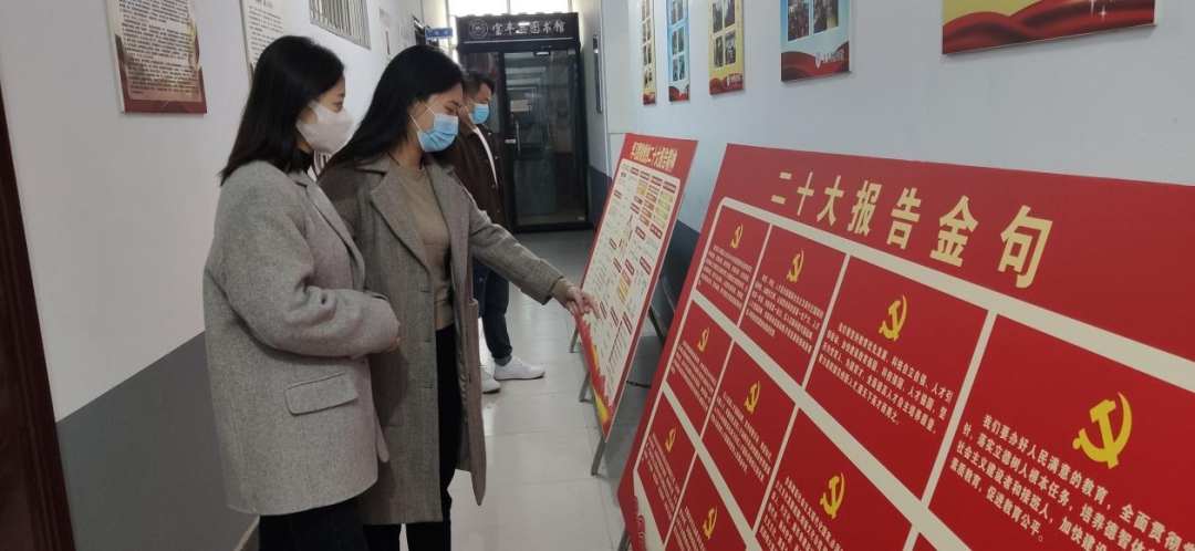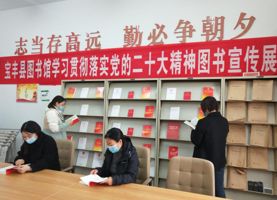 舉辦展覽,營造氛圍。利用縣圖書館資源,開展“學習貫徹落實黨的二十大精神圖書宣傳展”活動。展覽歷時一個月,展出書籍涵蓋了《中國共產黨黨章》《二十大報告輔導讀本》《黨的二十大報告學習輔導百問》《中國共產黨第二十次全國代表大會文件匯編》《黨的二十大報告》(單行本)等多種關于“二十大精神”的系列圖書。組織開展了“黨的二十大精神”和“黨的二十大金句”圖片宣傳展活動。