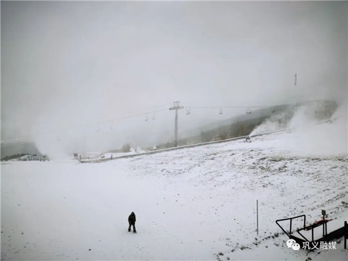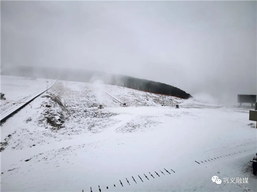站在夾津口鎮(zhèn)嵩頂放眼望去,整個嵩頂銀裝素裹,分外美麗。嵩頂滑雪場造雪機正在加緊造雪,為2022—2023年雪季到來做準備。