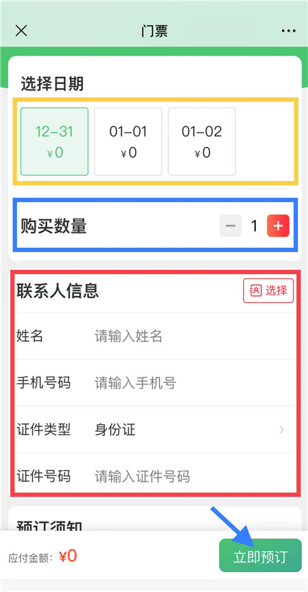 (5)進(jìn)入預(yù)定界面,選擇您要參觀的日期,購買數(shù)量,輸入您相應(yīng)的購票信息,點擊立即預(yù)訂,即可完成預(yù)約。