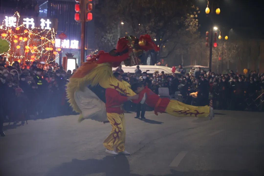 “咚咚鏘,咚咚鏘……”當(dāng)晚7時(shí),伴隨著喧天的鑼鼓聲,受邀前來(lái)的社火隊(duì)伍換上了節(jié)日的盛裝,踏著喜慶的鼓點(diǎn),和著歡快的節(jié)拍走進(jìn)朝歌老街文昌閣廣場(chǎng)。盤鼓、舞龍、踩高蹺、竹馬、戲獅等精彩節(jié)目接連上演,演員們個(gè)個(gè)精神抖擻、喜氣洋洋,觀眾們熱情高漲,現(xiàn)場(chǎng)瞬間變成了一片歡樂的海洋,大家沉浸在濃濃的節(jié)日氛圍里,感受著傳統(tǒng)佳節(jié)獨(dú)有的魅力。