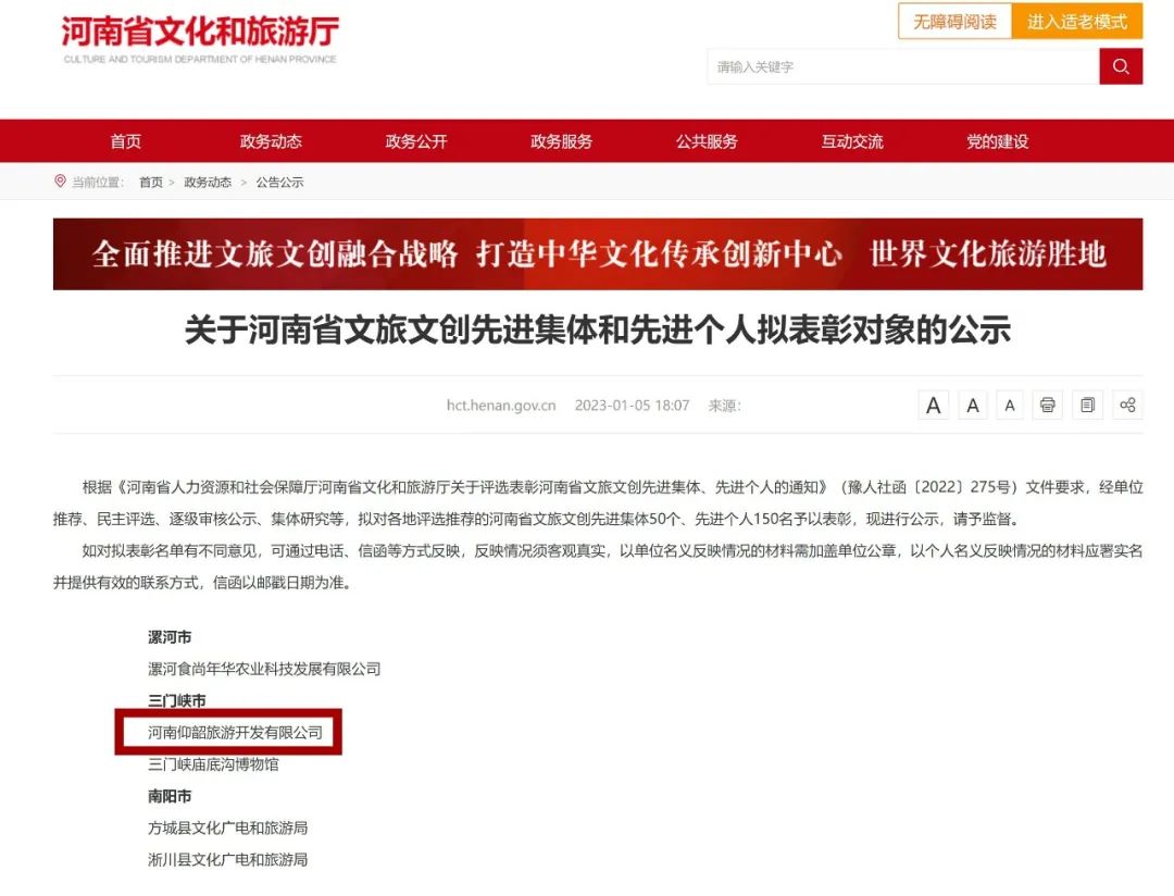 近日,根據(jù)《河南省人力資源和社會(huì)保障廳 河南省文化和旅游廳關(guān)于評(píng)選表彰河南省文旅文創(chuàng)先進(jìn)集體、先進(jìn)個(gè)人的通知》公示結(jié)果,河南仰韶旅游開發(fā)有限公司和三門峽廟底溝博物館代表三門峽優(yōu)秀文旅文創(chuàng)集體,被授予“河南省文旅文創(chuàng)先進(jìn)集體”榮譽(yù)稱號(hào)。