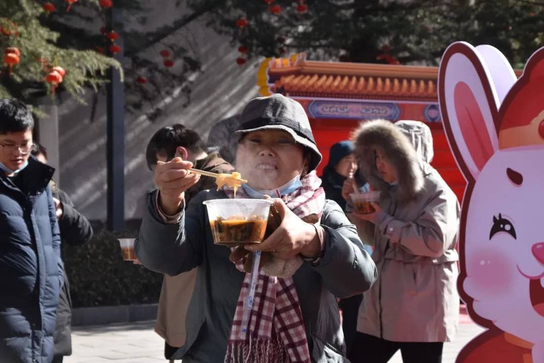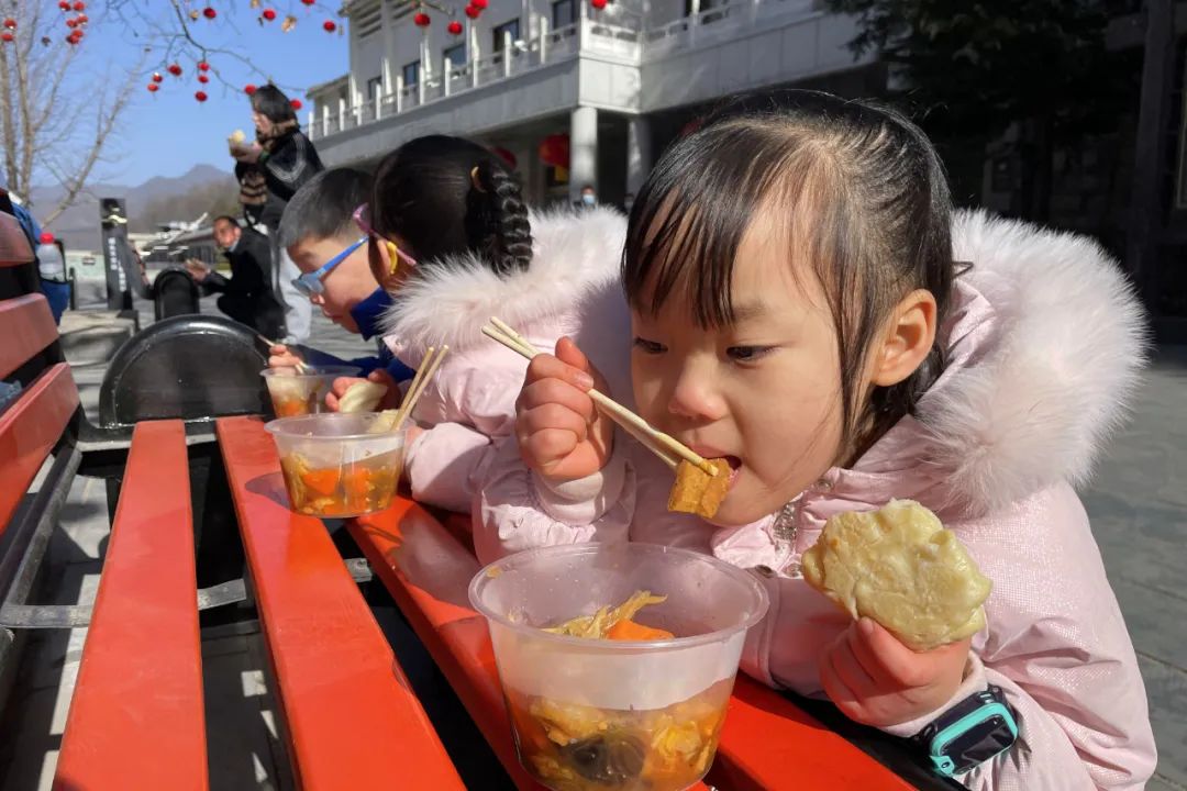大年初三雖然天氣晴朗,但數(shù)九寒天依然寒冷,現(xiàn)場游客自覺排起長隊(duì),有序領(lǐng)取景區(qū)準(zhǔn)備的“五福菜”。綠色健康、鮮香味美的“五福菜”讓游客朋友贊不絕口,大快朵頤!