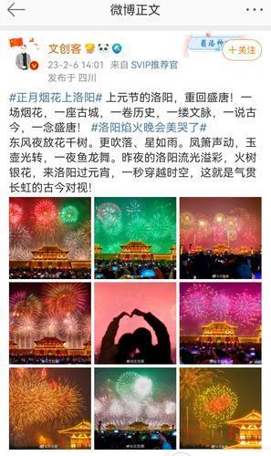 微博大V“文創(chuàng)客”也借助煙花推介洛陽(yáng):“一場(chǎng)煙花,一座古城,一卷歷史,一縷文脈,一說古今,一念盛唐!……昨夜的洛陽(yáng)流光溢彩、火樹銀花,來洛陽(yáng)過元宵,一秒穿越時(shí)空,這就是氣貫長(zhǎng)虹的古今對(duì)視!”