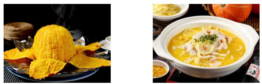 八寶烤南瓜、招牌酸菜豆花魚、創(chuàng)意野菜丸子、自制醬香肉、手工生煎包、大盤香米排骨