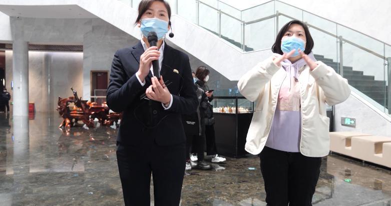 2月12日,記者在河南省平頂山市汝州市青瓷博物館看到,館內(nèi)的講解員和手語翻譯員相互配合,為前來參觀的游客進行服務(wù)。