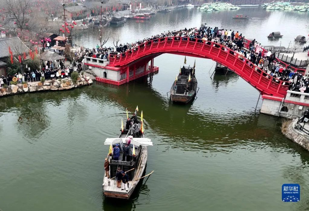 2月18日,游客在開封清明上河園景區(qū)觀看民俗表演(無人機照片)。
