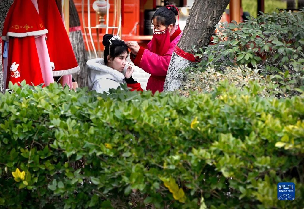游客在開封清明上河園景區(qū)內(nèi)穿傳統(tǒng)服飾(2月14日攝)。