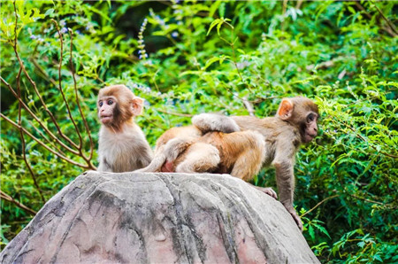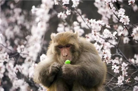 桃花灼灼,燦若云霞,頑皮的獼猴點(diǎn)綴其間,湖面如鏡,遠(yuǎn)山如黛,仿若置身古人筆下的世外桃源。