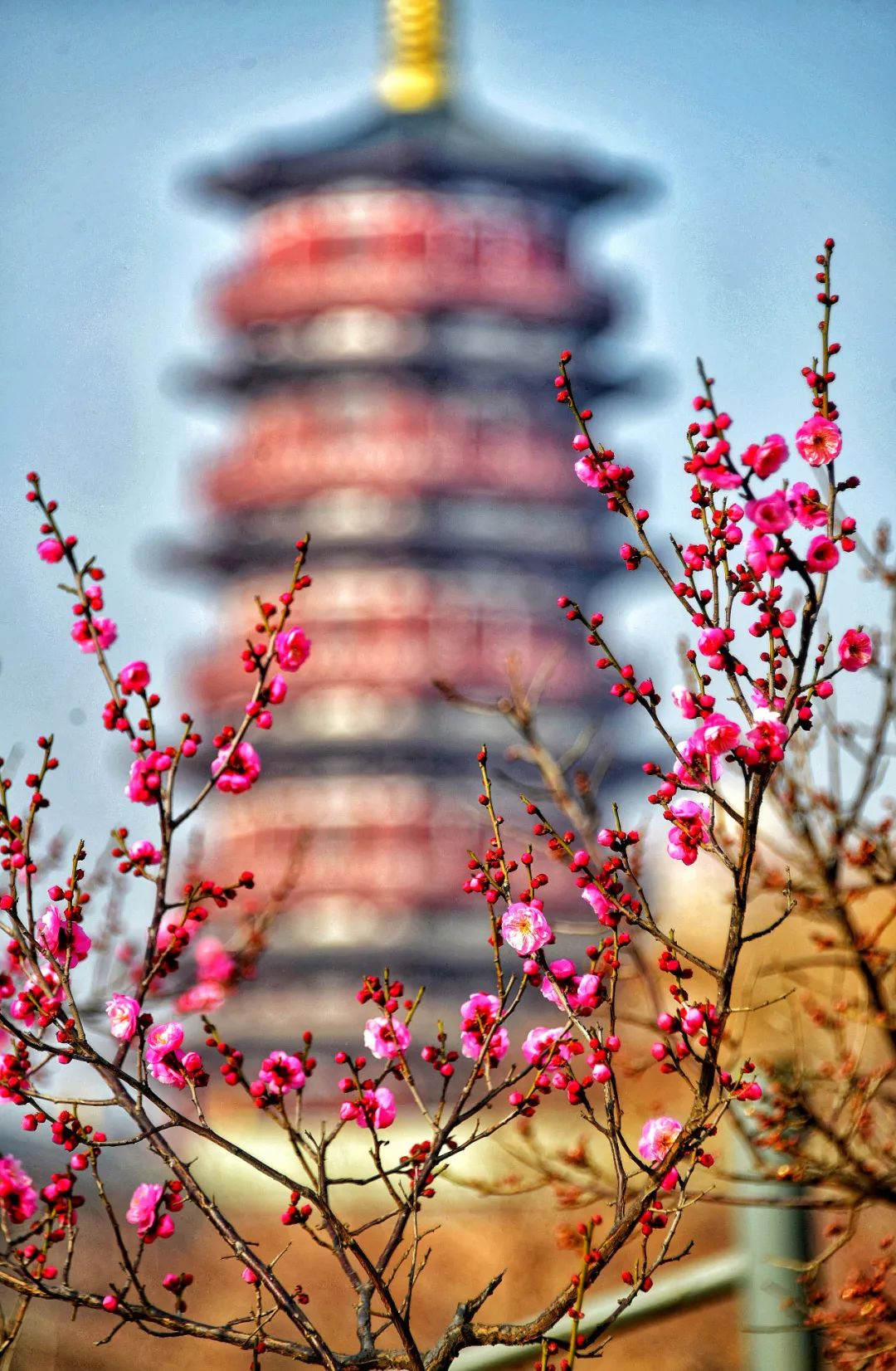 朱櫻塔東邊的梅花已然盛放,吸引著眾多攝影愛好者賞花拍照,梅林映襯著朱櫻塔,十分雅致。