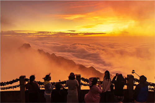 因?yàn)橛性坪,每一個(gè)日出顯得格外熱烈,黎明,霞光浸染了白云,云朵飄蕩著將白云山,書(shū)寫(xiě)成一幅巨大的寫(xiě)意油畫(huà),掛在白云山的東邊,晨光和濃霧造就了白云山絕美的日出,在云霧繚繞中太陽(yáng)噴薄而出,那種新生的感覺(jué)震撼著每位親臨者的內(nèi)心。