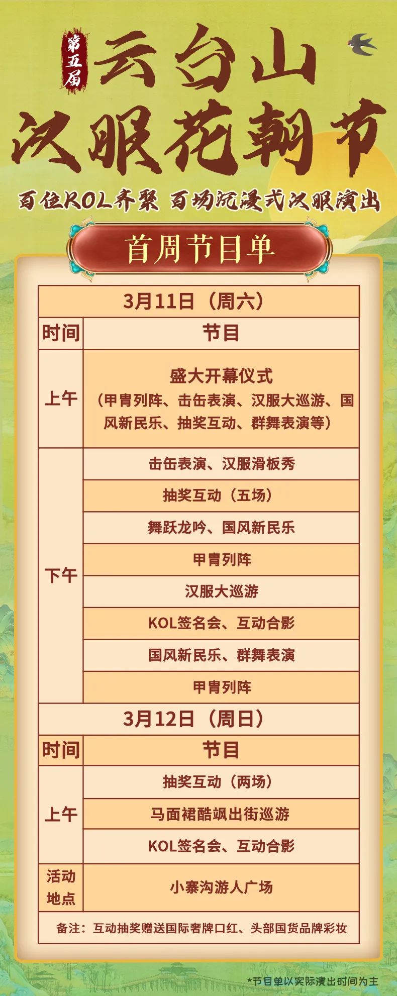 漢服KOL走秀,曲水流觴,裙幄之宴,漢服婚禮,甲胄列陣,擊缶而歌,國風民樂,現(xiàn)場簽名會,漢服滑板秀,萬名漢服同袍暢游春日花海。