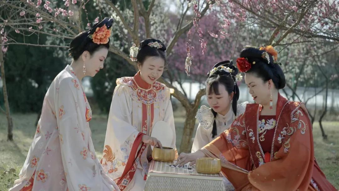 活動中,女職工們穿著漢服,帶著精致的妝容暢游景區(qū)。在鮮花水木盆中沾手擦拭,在戶外進(jìn)行煮茶對弈,由專業(yè)老師帶著繪制蒲扇和進(jìn)行印染體驗,女職工們還進(jìn)行了投壺游戲,在暮色下,她們手提花燈,夜游景色。