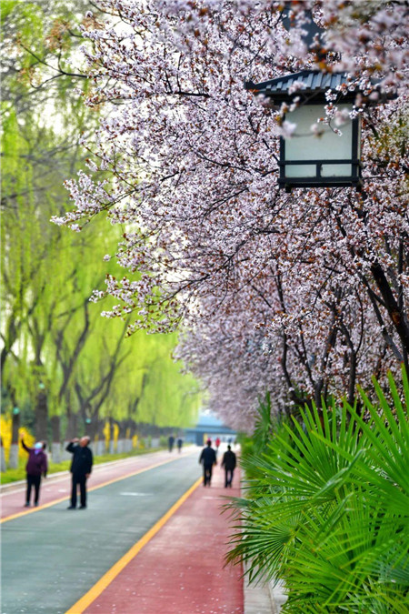 湖邊嫩柳依依,園中百花齊放,用夕陽的光暈做背景,隨手一拍就是唯美大片!