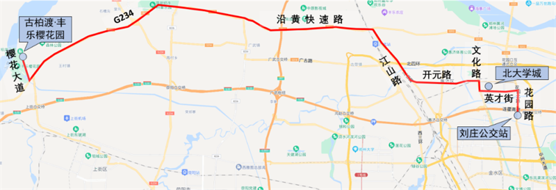 該線路為古柏渡豐樂櫻花園景區(qū)與鄭州主城區(qū)北部高校園區(qū)的連接線路,滿足市區(qū)乘客游玩出行需求。