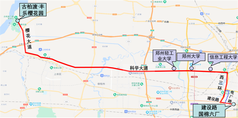 該線路為古柏渡豐樂櫻花園景區(qū)與鄭州主城區(qū)西南區(qū)域客流集散中心的連接線路,滿足市區(qū)乘客游玩出行需求。
