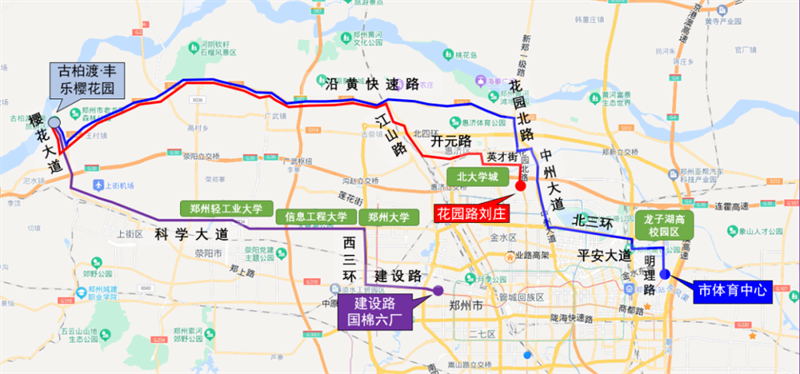 途經(jīng)道路:明理路、平安大道、東三環(huán)、北三環(huán)、中州大道、迎賓路、花園北路、沿黃快速路、櫻花大道。
