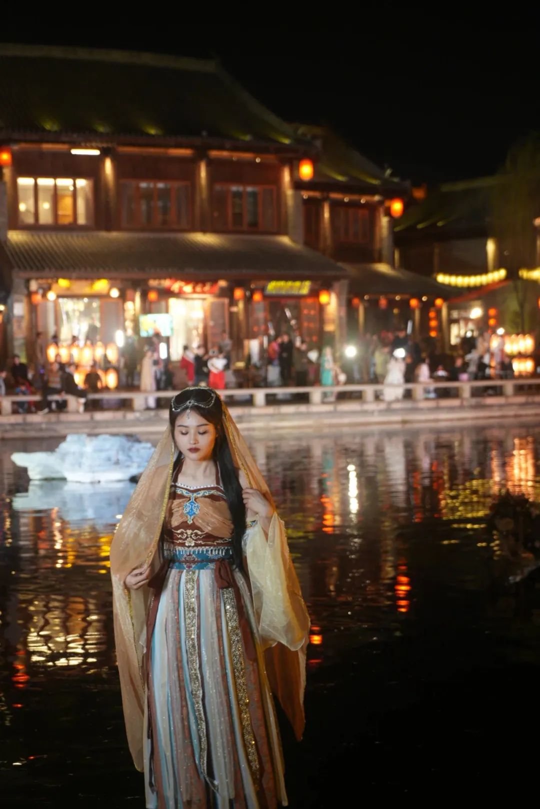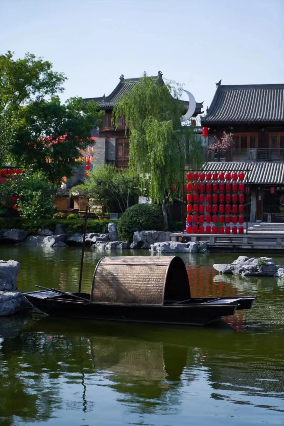 流水畫橋,燈籠朱盞,遠(yuǎn)望樓閣云天,重檐似山巒起伏。在這里拍一張漢服古韻大片,出片率99%。