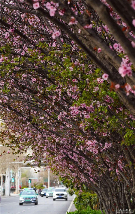 南三環(huán)南側的碧云路,道路中間的美人梅進入盛花期,粉紅色的花掛滿枝頭,整條街仿佛都成了浪漫的粉色。