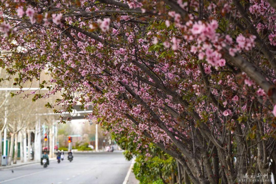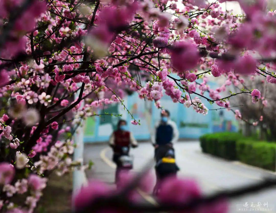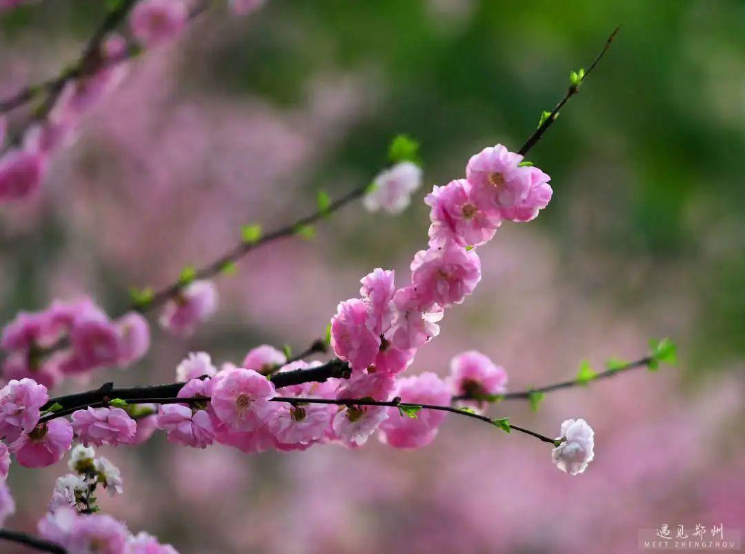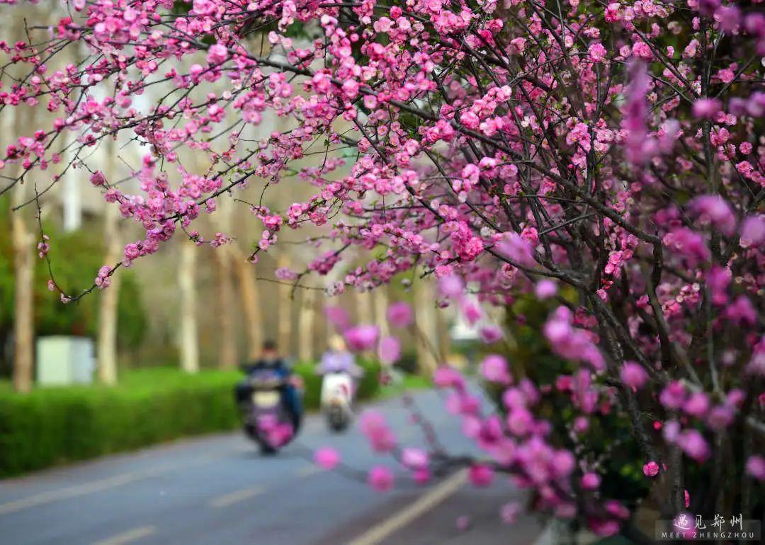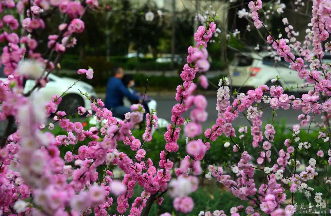 鄭州街頭的美人梅、榆葉梅也次第開放,茂密的枝條隨風舒展,濃艷淺淡的繁花緊貼枝條,撩人心弦。