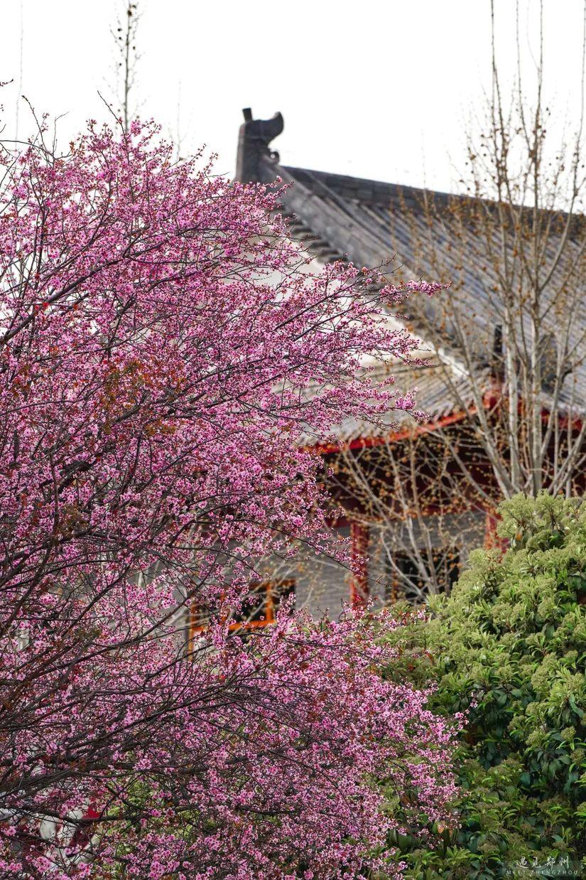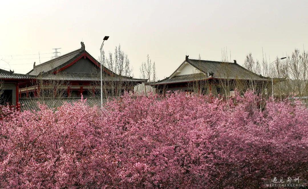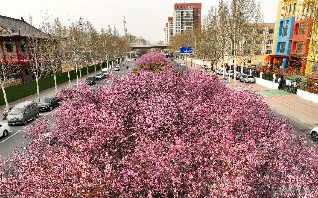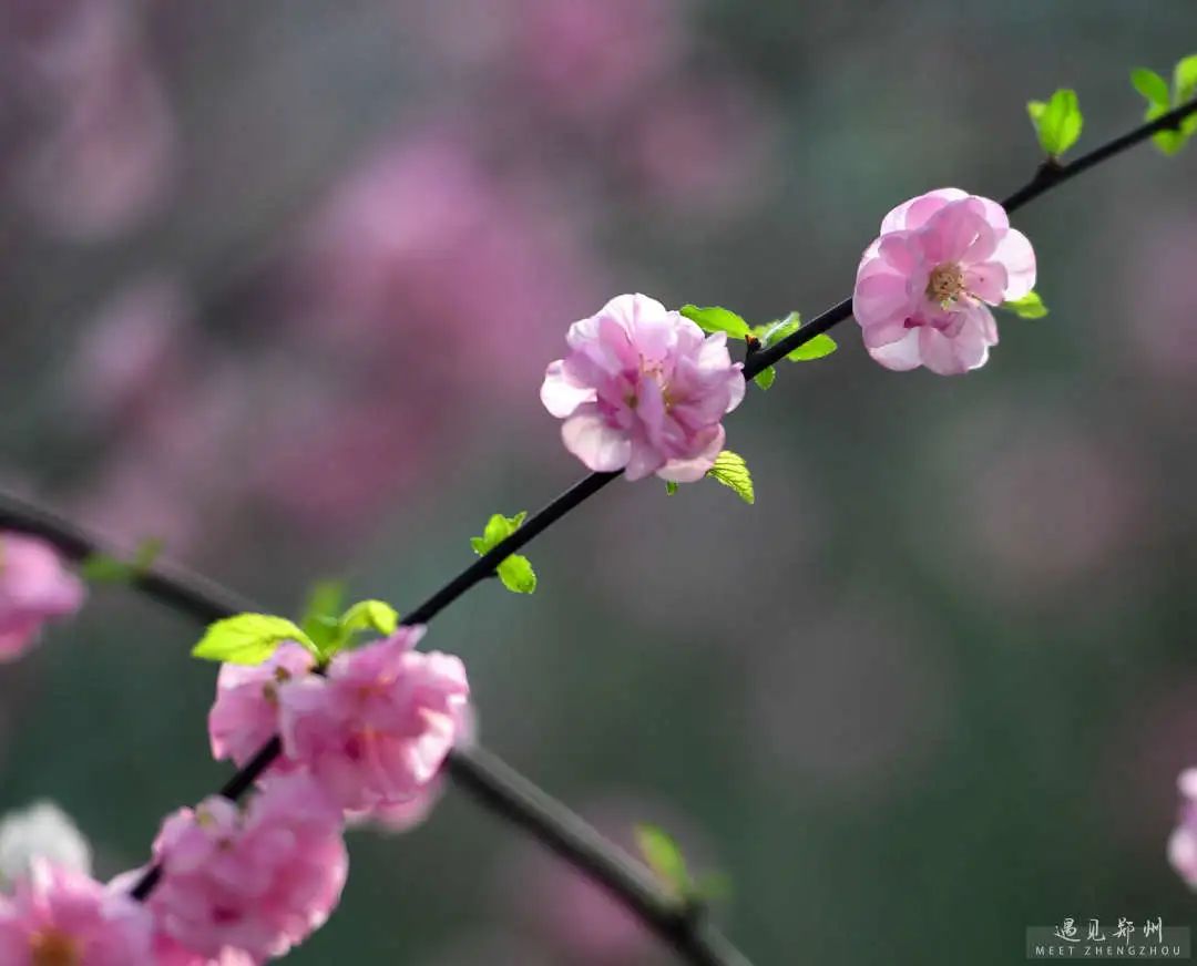 鄭州街頭的美人梅、榆葉梅也次第開放,茂密的枝條隨風舒展,濃艷淺淡的繁花緊貼枝條,撩人心弦。