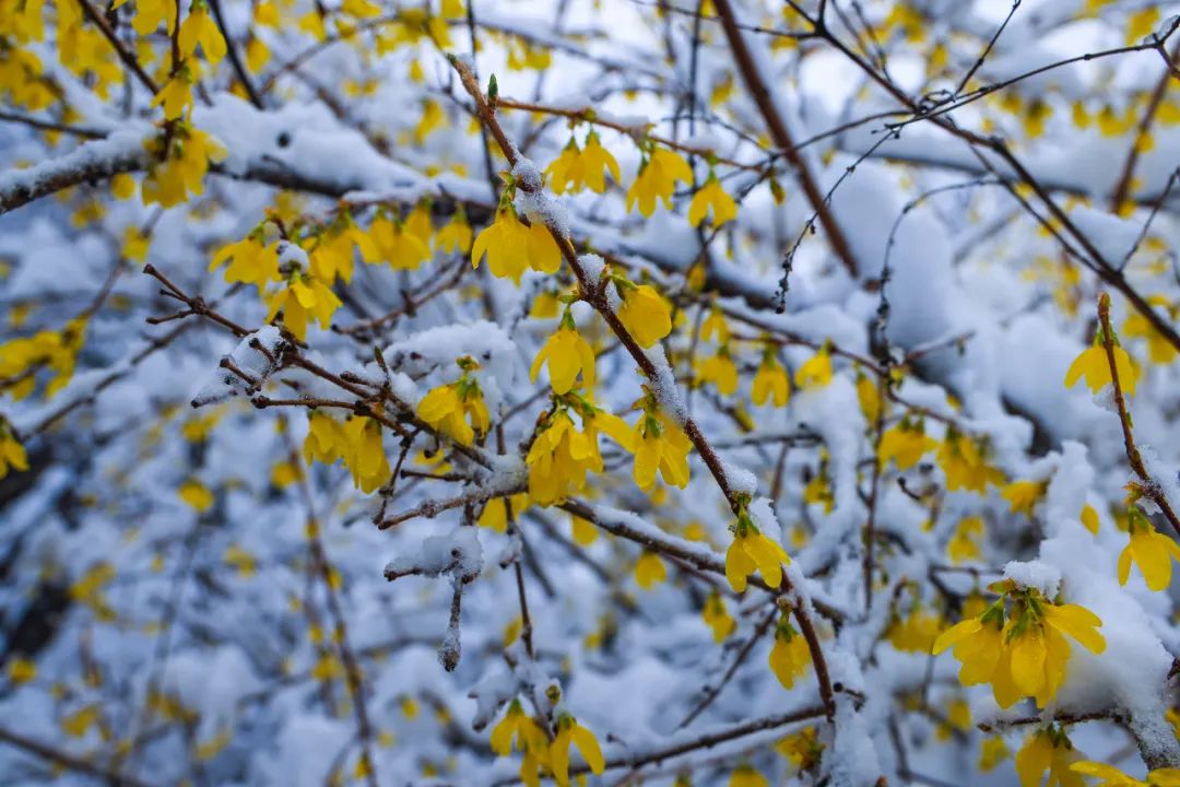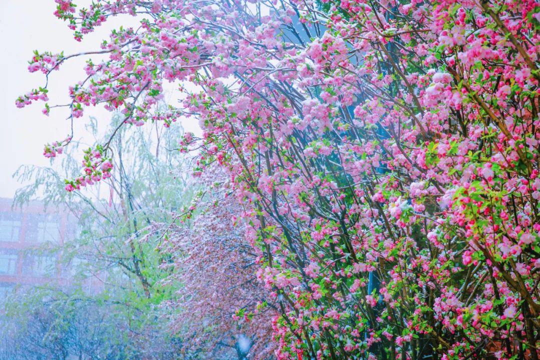 春花遇春雪 ,怒放的桃花、杏花、連翹等山花 ,在白雪的裝扮下 ,嬌艷欲滴,別有一番風韻。