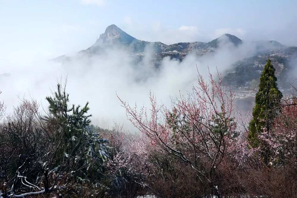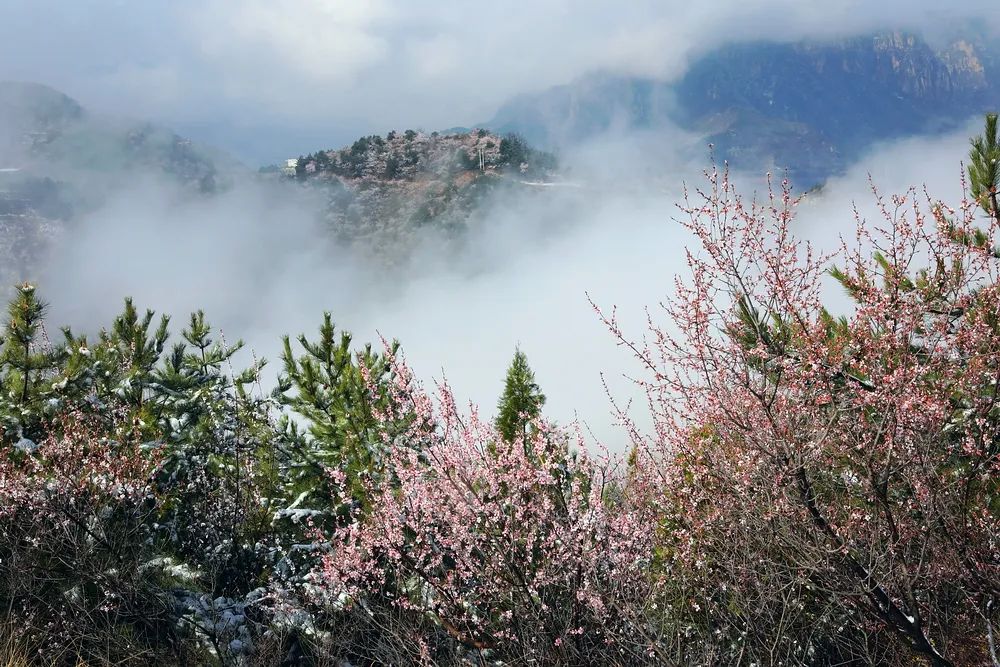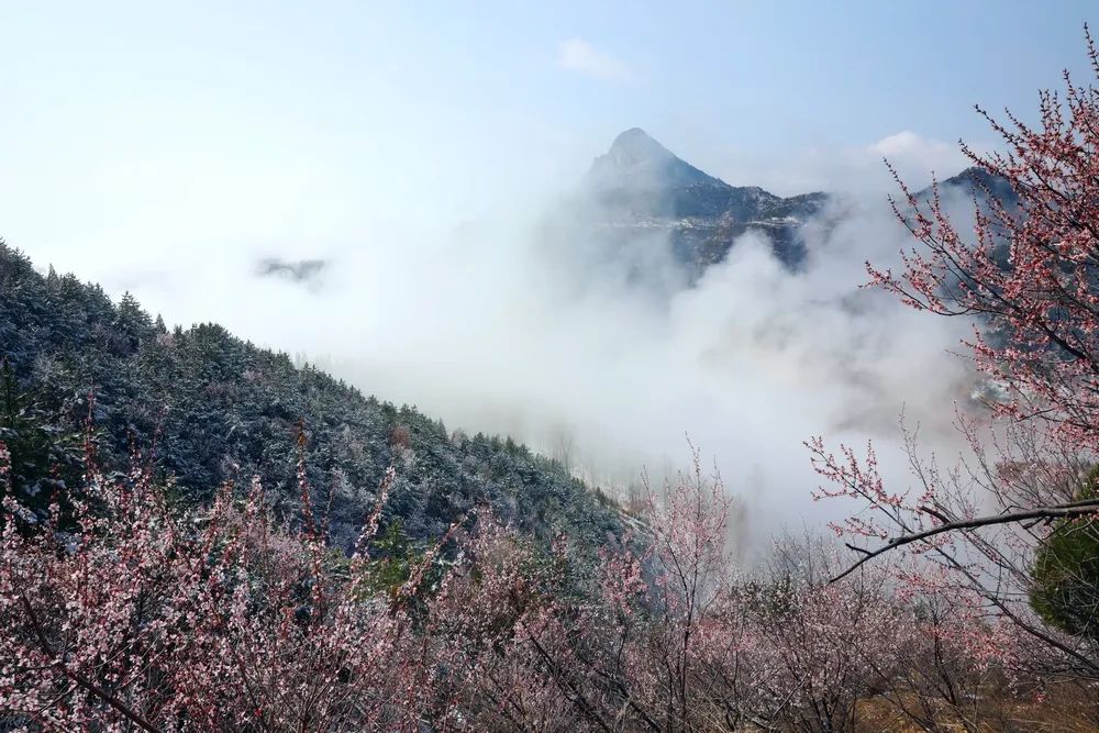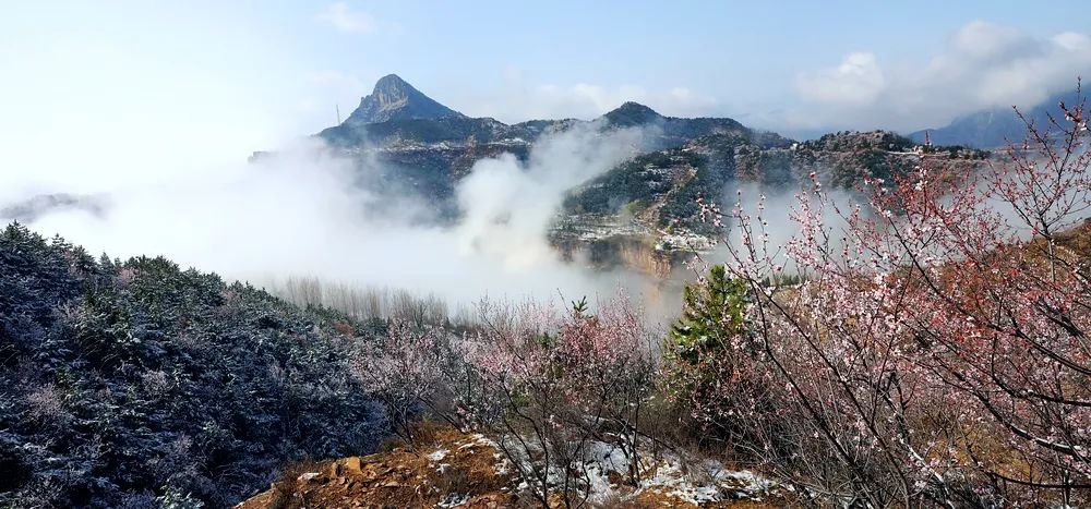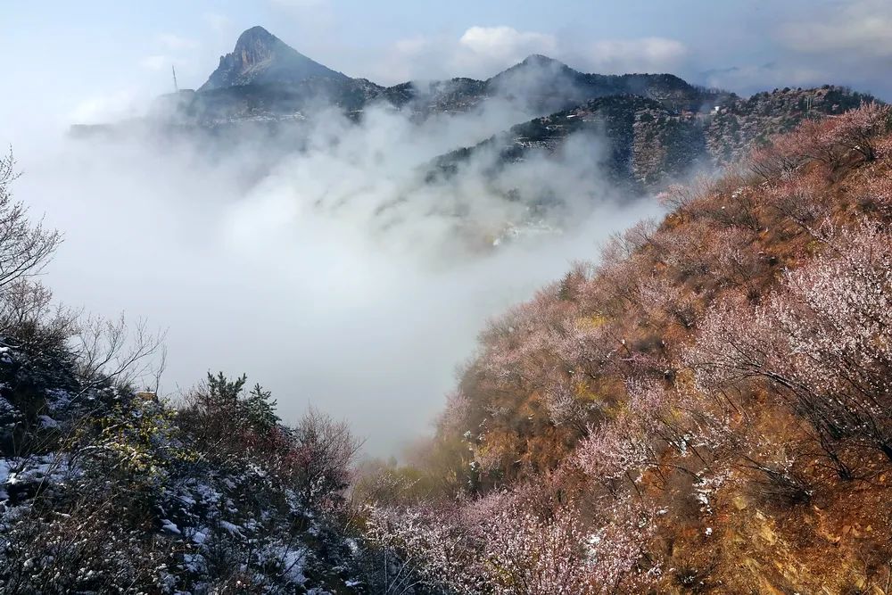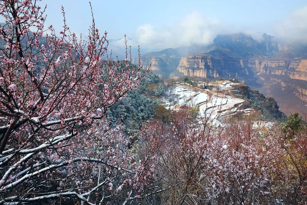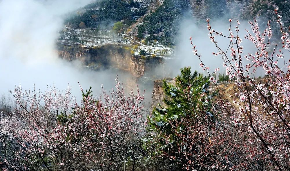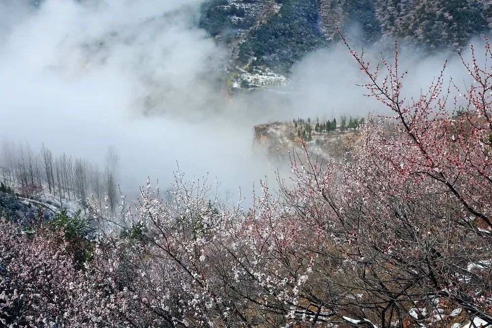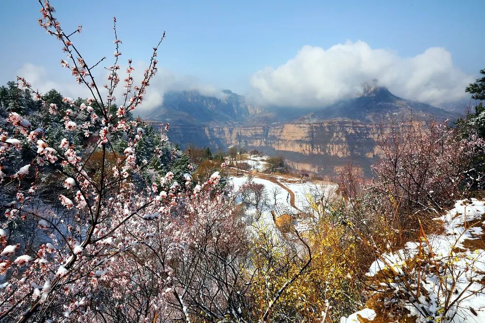 漫步在巍峨秀麗的太行山上,置身在群山峻嶺中,環(huán)顧山間、懸崖邊,處處是春,處處是景,半山春色半山寒,在紅與白的水墨世界里,絢爛多姿。當怒放的山花遇上了三月飄雪,花芬芳,雪潔白,讓人如癡如醉,流連忘返。