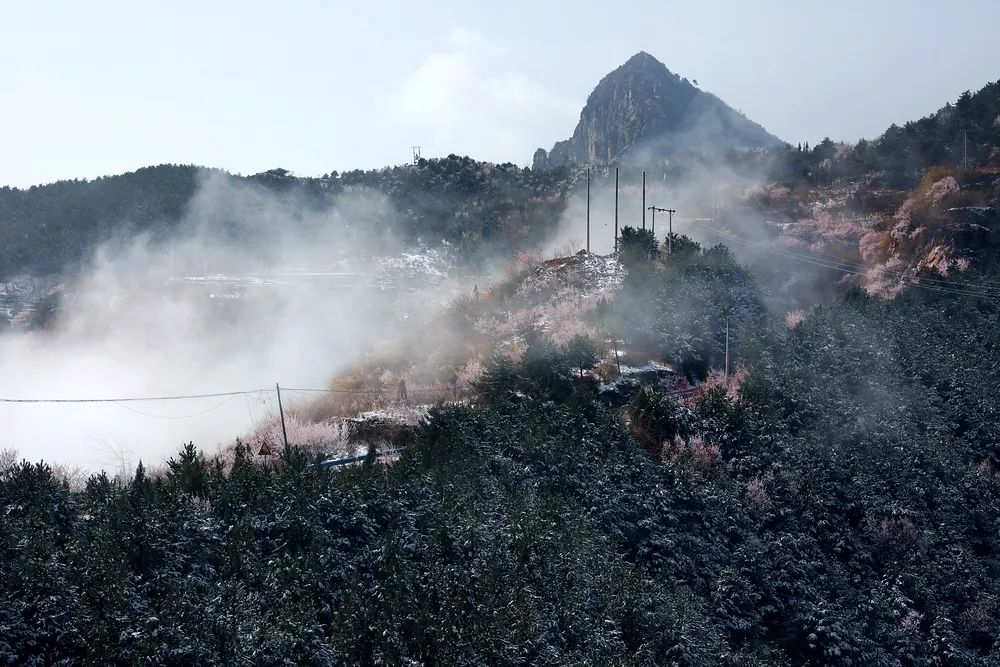 三月林州,本是一片桃花爛漫,邀友踏春的季節(jié)。一場雨,林州出現(xiàn)了難得一見的“三月桃花雪”。雪后的林州太行山,云霧穿梭游動,與山村、遠山、花海交相輝映,如潑墨山水畫卷。綠樹紅花,云霧白雪,山巒間云霧繚繞,宛若步入仙境一般,美不勝收。