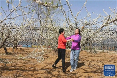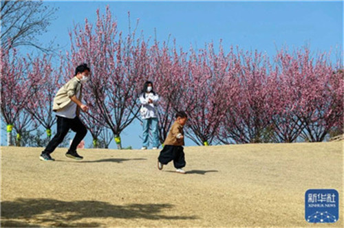 3月13日,游人在平頂山市郟縣馬頭嶺現(xiàn)代農(nóng)業(yè)觀光示范園里,賞花游玩。謝雯 攝