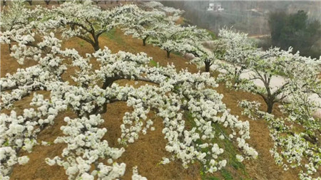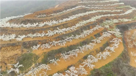 從空中俯瞰李花連成片,似雪花墜落在青綠的山林間,呈現(xiàn)出一幅春意盎然的美麗鄉(xiāng)村畫面!
