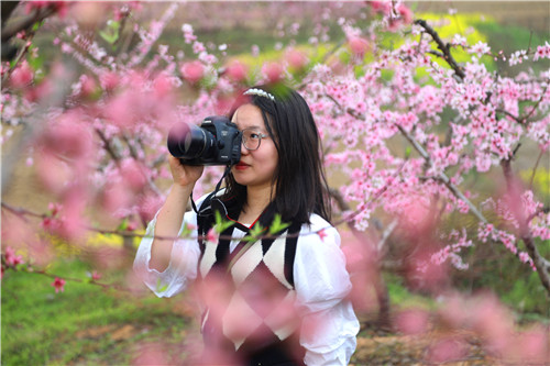 漫步桃花林,放眼望去,一片粉色的海洋此起彼伏,微風(fēng)拂過,粉色的花海隨風(fēng)波動,花香迎面撲來。“十里桃花”盛景吸引游客紛紛拿起手機、相機將這一美好畫面記錄下來。