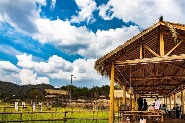 油菜花里有草棚茶舍,品茗的人們似乎可以伸手觸摸白云。