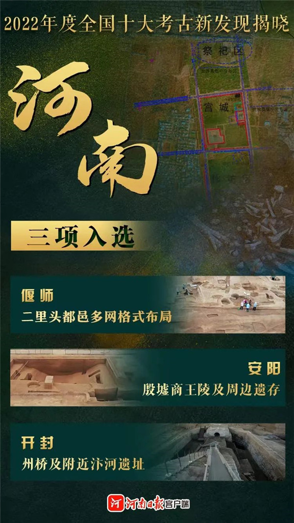 3月28日,由中國(guó)文物報(bào)社、中國(guó)考古學(xué)會(huì)主辦的2022年度全國(guó)十大考古新發(fā)現(xiàn)在北京揭曉,河南偃師二里頭都邑多網(wǎng)格式布局、安陽(yáng)殷墟商王陵及周邊遺存、開(kāi)封州橋及附近汴河遺址等三項(xiàng)入選。河南成為此次入選項(xiàng)目最多的省份。至此,我省入選全國(guó)十大考古新發(fā)現(xiàn)的項(xiàng)目達(dá)53項(xiàng),繼續(xù)領(lǐng)跑全國(guó)。