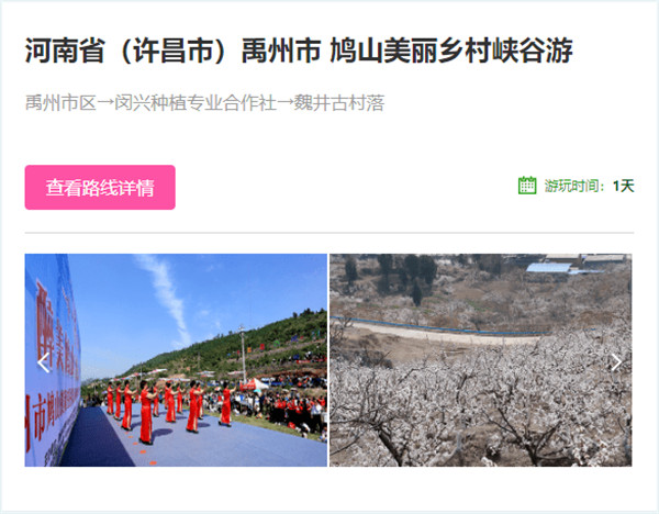 近日,在農(nóng)業(yè)農(nóng)村部鄉(xiāng)村產(chǎn)業(yè)司評(píng)選的2023年中國(guó)美麗鄉(xiāng)村休閑旅游行(春季)精品景點(diǎn)線路推介中,禹州市鳩山美麗鄉(xiāng)村峽谷游位列其中,快來(lái)看看鳩山被“相中”的美——