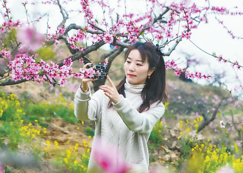 游客在魯山縣下湯鎮(zhèn)林樓村萬畝桃園賞花拍照 馬進(jìn)偉 攝