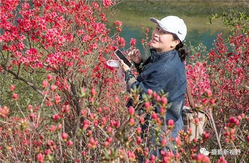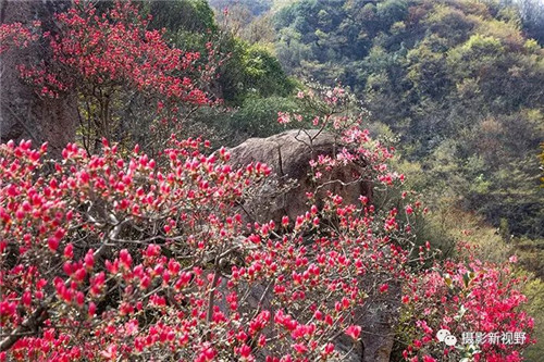 映山紅怒放枝頭,賞花游客醉在花海中。