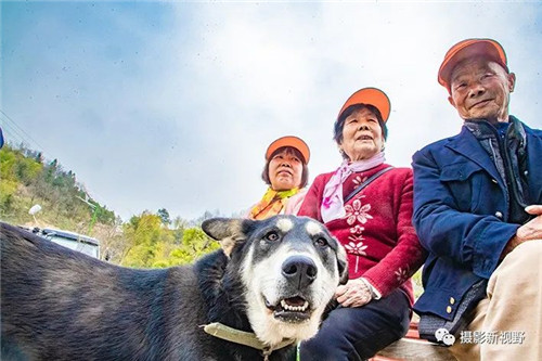 大叔、大媽和狗狗,一起沐浴春光中。