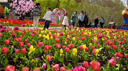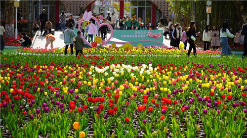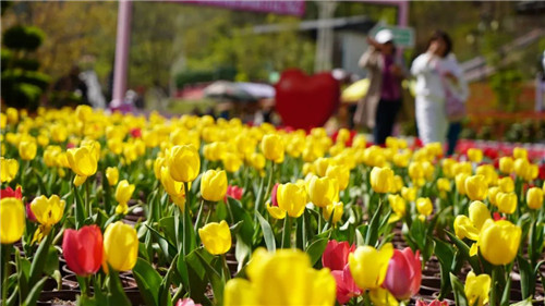 在雞冠洞的郁金香花海里,班雅、范依克、普利西瑪、阿波羅精華、挪威太陽等近30萬株郁金香美不勝收,紅的、白的、紫的、黃的、紅黃相間的一株株郁金香分外奪人眼球。還有不少游客身著漢服在花海中自拍、合影,記錄春日盛景。“帶家人來賞花、看節(jié)目,特別高興。尤其是帶孩子來到這個大的花田中,還能和玩偶互動,心情特別愉快。”游客王麗說。