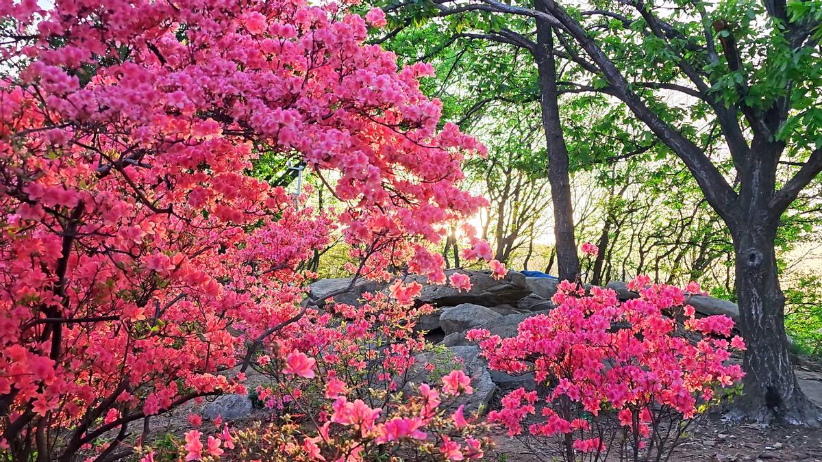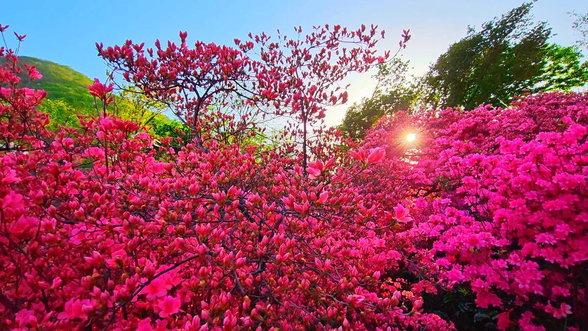 一叢叢,一簇簇,一片片,如團(tuán)火,似朝霞。它們有的向陽而生,在半山坡上蓬蓬勃勃;有的“躲”在森林中,盡管三三兩兩,卻也遙相呼應(yīng);有的則“端坐”在道路的兩旁,向來來往往的車輛與游客行“注目禮”。這便是一種普通卻蘊(yùn)含深意的花兒,它的名字叫映山紅。