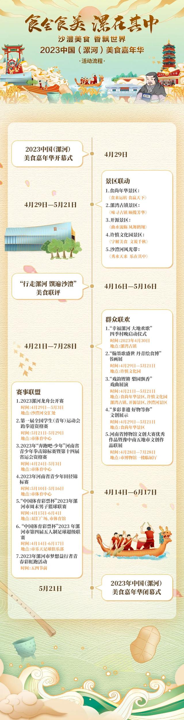 4月30日起,全市將在漯灣古鎮(zhèn)開展“尋找村寶”“唱響村歌”“擂響村戲”“共秀村藝”等活動;“翰墨歌盛世 丹青繪食博”書畫展將在許慎文化園舉辦;“戲韻鏗鏘 梨園飄香”戲曲展演活動將在各個(gè)景區(qū)舉行,包含《郾城大捷》《七星劍》《戰(zhàn)洪州》《包青天》《五世請纓》等豫劇精品劇目;“多彩非遺 好物等你”文創(chuàng)展也將走進(jìn)景區(qū)。