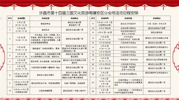 許昌第十四屆三國文化旅游周建安區(qū)分會場活動由中共建安區(qū)委、建安區(qū)人民政府共同主辦,將于2023年4月26日至5月3日在建安區(qū)北海廣場舉行。本屆三國文化旅游周建安區(qū)分會場將推出“品三國文化、賞頭上時裝、游精品路線、促招商消費(fèi)”四大系列活動。